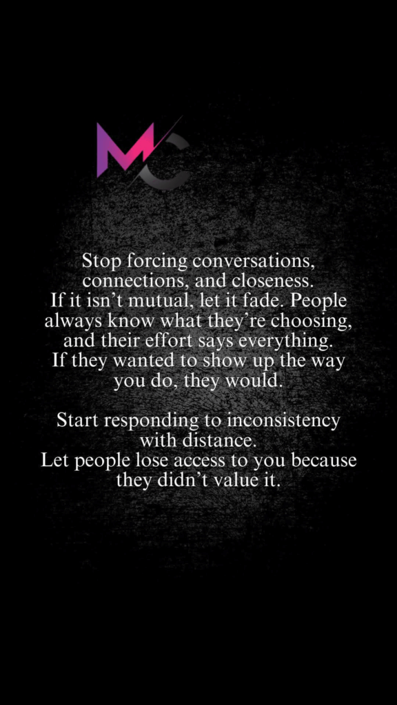You teach people how to treat you by what you tolerate. So stop tolerating neglect. Stop rationalizing ambivalence. Your peace is too valuable to be left in the hands of someone who doesn’t know its worth. Let go of the forced connections. Make room for the ones that are easy, that are mutual, that feel like coming home. Your energy is sacred. Guard it. And only share it with those who understand the assignment.