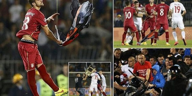 Përballja e sotme rikthen në vëmendje incidentin e mbi dhjetë viteve më parë, ku ndeshja mes dy kombëtareve u ndërpre në fund të pjesës së parë, për shkak të futjes së tifozëve serbë në fushë dhe përleshjes me lojtarët shqiptarë. Një dron me flamurin shqiptar dhe portretet e Ismail Qemalit dhe Isa Boletinit ‘ndezi’ atmosferën.