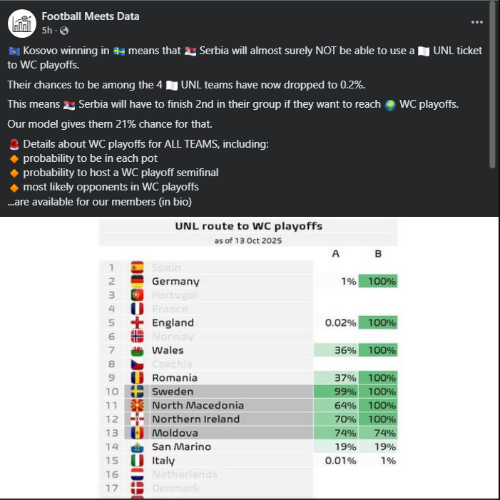 Sipas platformës së statistikave dhe të dhënave, “Football Meets Data”, ky rezultat do të thotë se Serbia pothuajse nuk ka më asnjë mundësi për të përdorur biletën e Ligës së Kombeve (UNL) për të arritur në fazën “play off” të Kupës së Botës.
