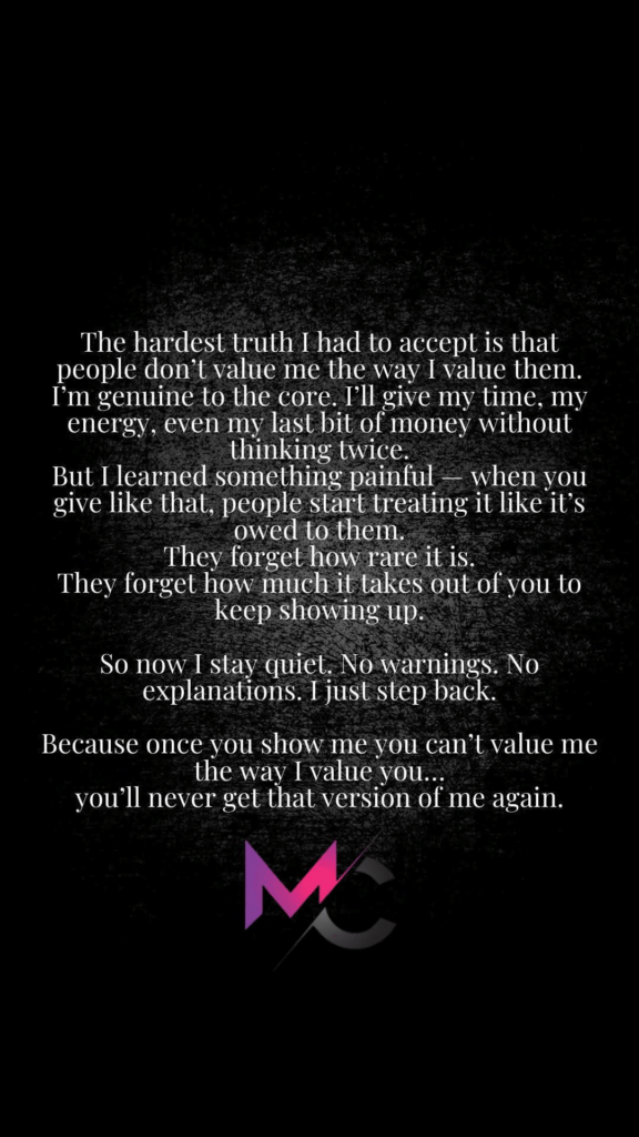 Because once you show me you can’t value me the way I value you… once you make it clear that my presence is a convenience and not a privilege… you’ll never get that version of me again.
